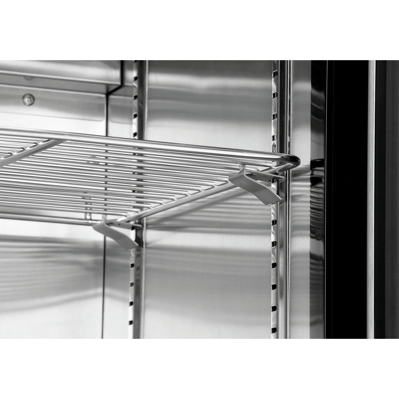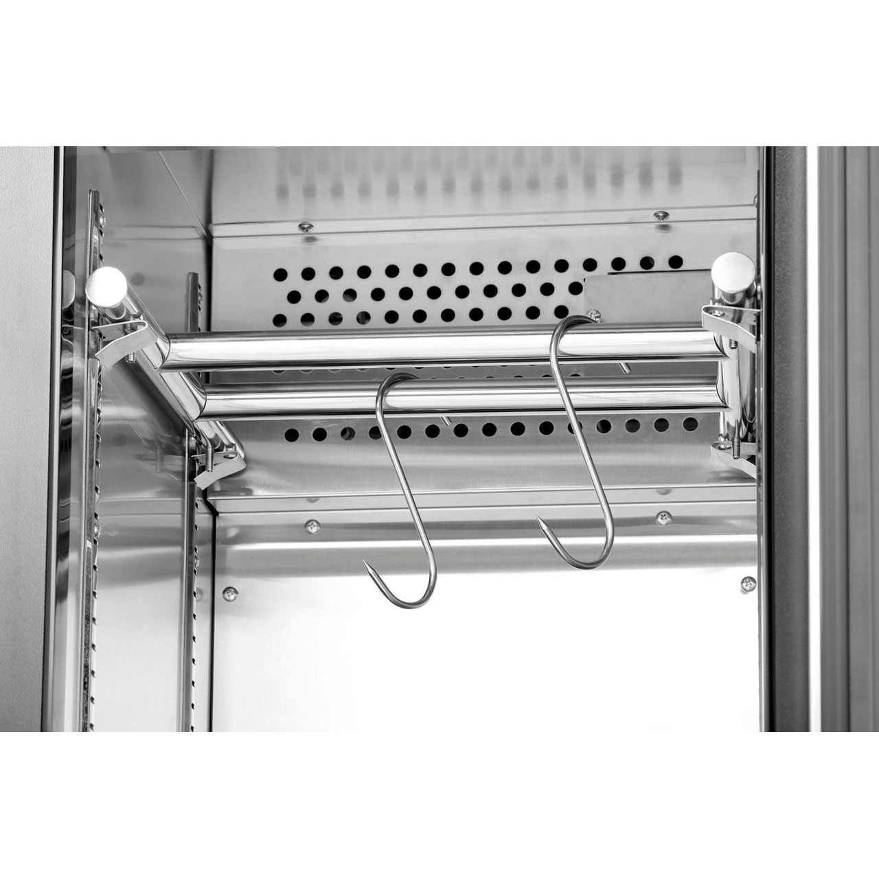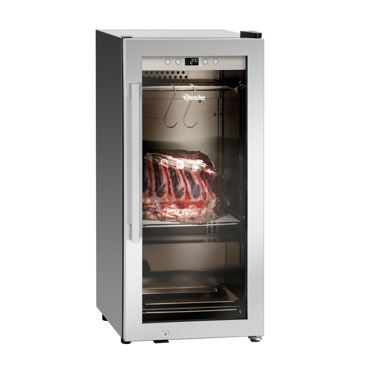 Lednice na zrání masa. Obsah 63 litrů. Teplotní rozhraní od 2 do 14 °C, elektronická regulace teploty po 1 °C. Vlhkost vzduchu 50 - 85 % regulovatelná po 1 %. Okolní teplota 18°C až 38°C. Jeden filtr s aktivním uhlím. Termostat, izolace cyklopentan, UV lampa. Chlazení cirkulující vzduch, chladivo R600a / 0,023 kg. Odpařování kondenzátu. Skříň je uzamykatelná, LED osvětlení. 1 skleněné křídlové dveře (trojité zasklení), pant dveří vpravo (nelze změnit), tónované sklo s UV filtrem, bezpečnostní. Výškově nastavitelné nohy, ON/OFF, antibakteriální UV světlo, digitální ukazatel, dotykové ovládání, neutralizace zápachu díky filtru s aktivním uhlím. Manuální ovládání. Barva černá. Materiál ocelový plech, sklo, uvnitř ušlechtilá ocel. Včetně 1 aktivního uhlíkového filtru, 1 odkapávací miska, 1 rukojeť s montážním materiálem, 1 závěsný stojan + 3 řeznické háky, 1 nádrž na vodu + 1 náhradní nádrž + držák + odkapávací miska, 2 klíče, 4 nerezové mřížky. Obsah: 63 litrů. Zásobník vody 300 ml. 4 r