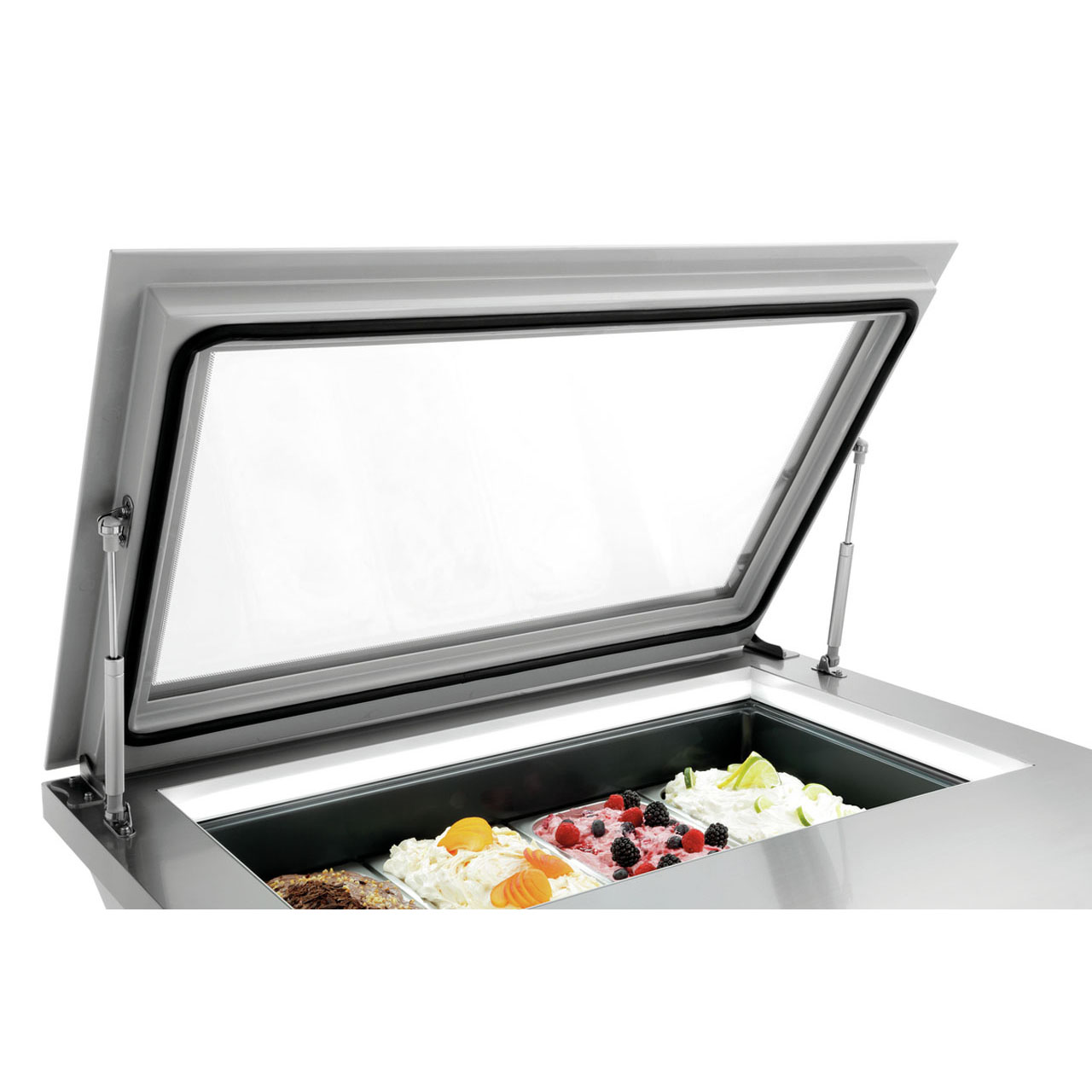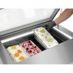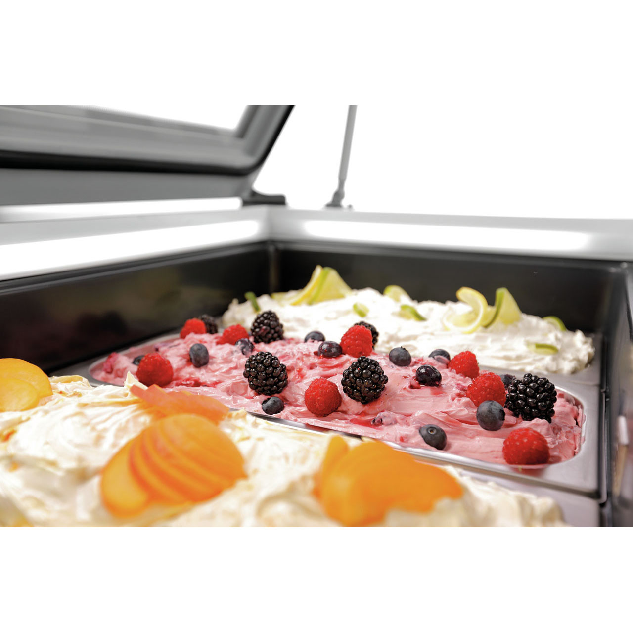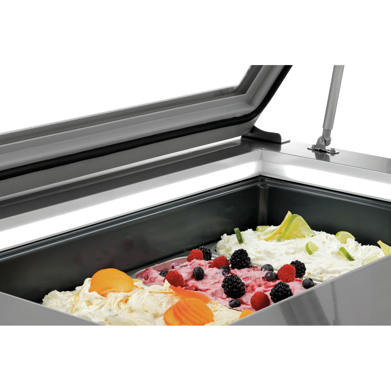 Kompaktní nerezová chladící vitrína na zmrzlinu má čtyři vyjímatelné nádoby, ideální prostorově nenáročné řešení pro každou restaurační kuchyni. Ploché skleněné víko s LED osvětlením vám umožní vidět všechny vaše chutné zmrzlinové pochoutky na první pohled, zároveň zabraňuje ztrátám teploty způsobeným otevíráním. Teplotní rozsah: -18C do -25C