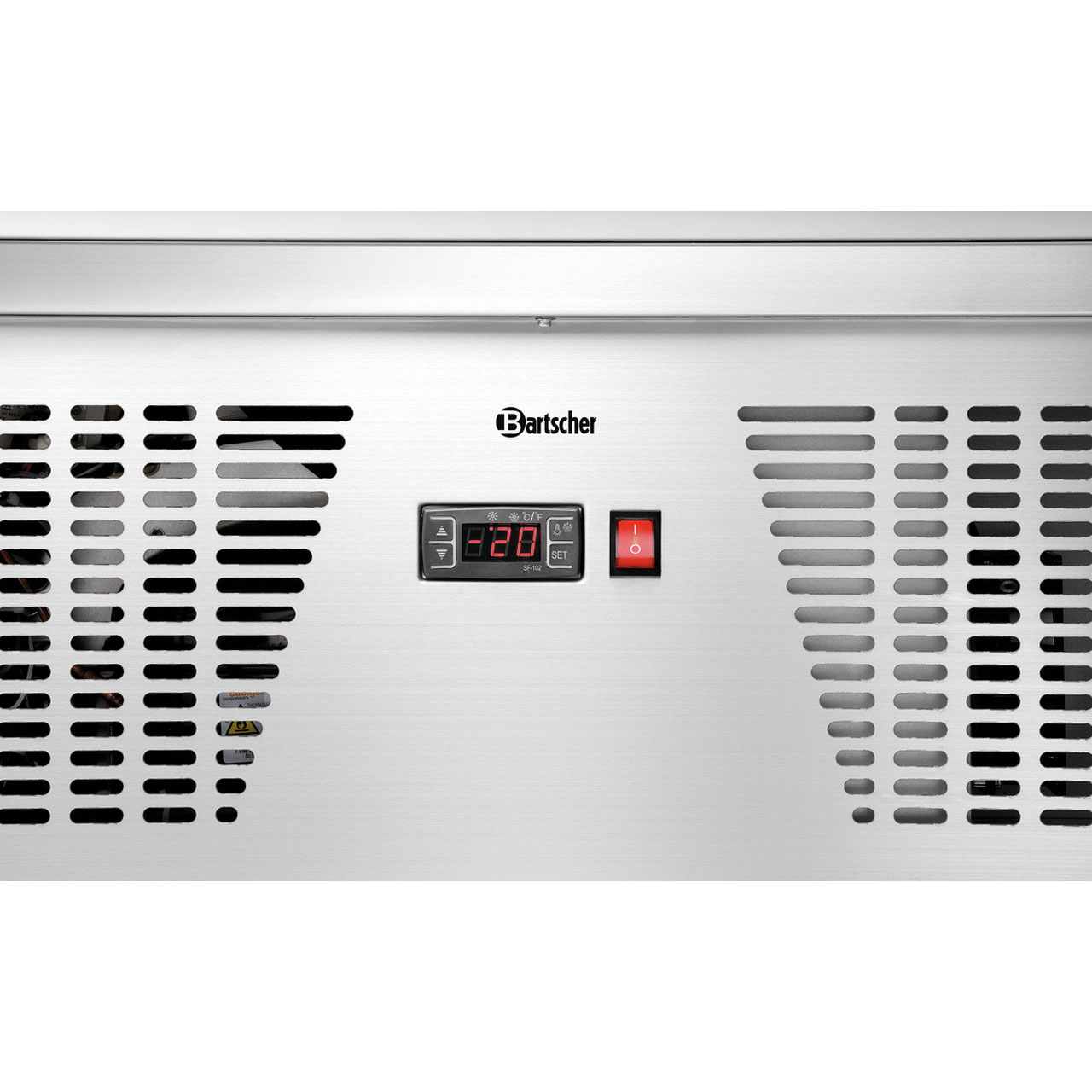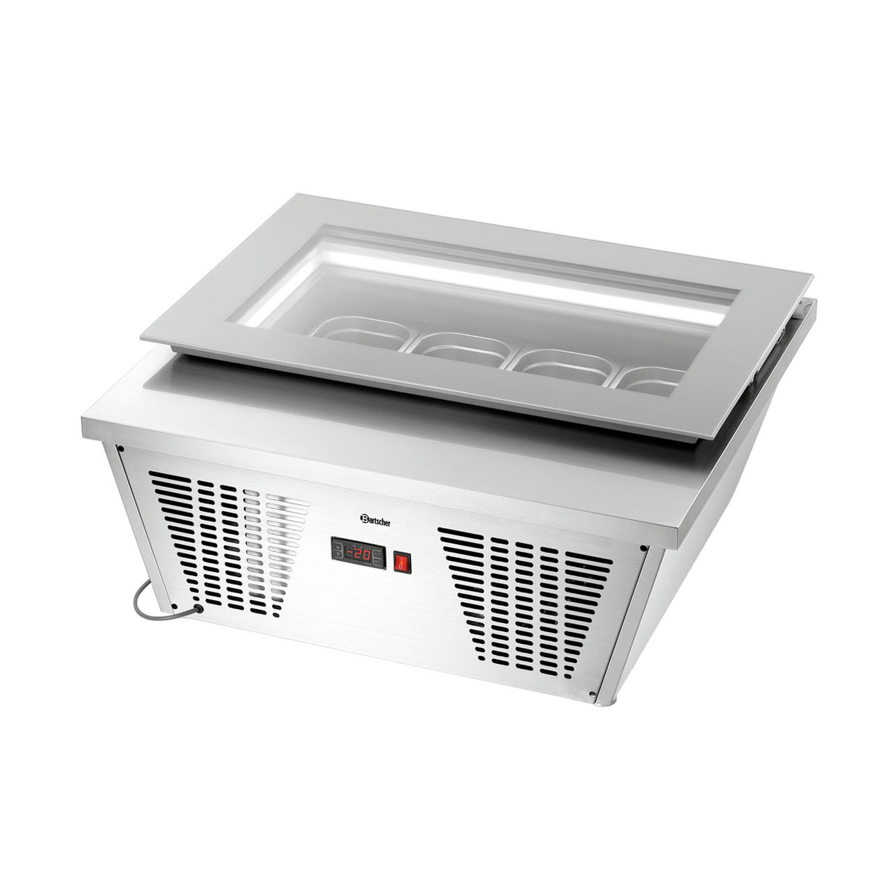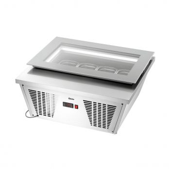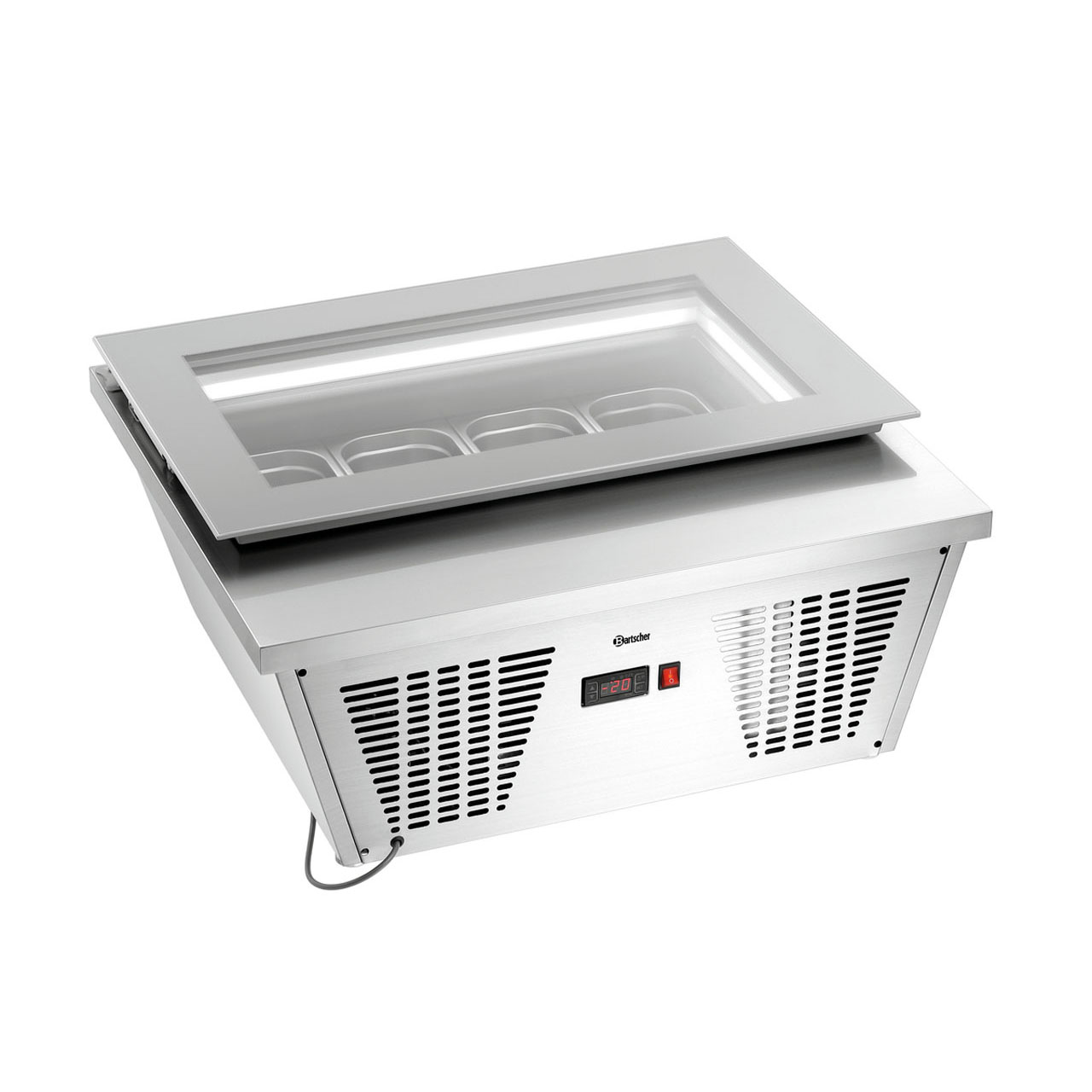 Kompaktní nerezová chladící vitrína na zmrzlinu má čtyři vyjímatelné nádoby, ideální prostorově nenáročné řešení pro každou restaurační kuchyni. Ploché skleněné víko s LED osvětlením vám umožní vidět všechny vaše chutné zmrzlinové pochoutky na první pohled, zároveň zabraňuje ztrátám teploty způsobeným otevíráním. Teplotní rozsah: -18C do -25C