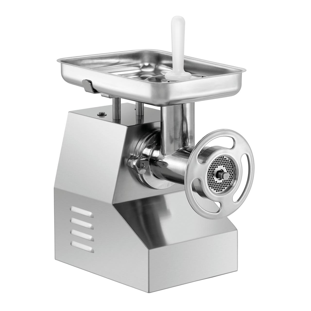 Mlýnek na maso se systémem Unger, extra velkým podávacím žlabem. Ventilovaný motor, až 500 kg/hod. Vyjímatelná skartovací jednotka umožňuje dočasné skladování v chladničce dle HACCP. Materiál pláště nerezová ocel. Jednoduchá obsluha. Zpětný chod, UNGER systém, ventilovaný motor, ochrana proti přetížení, indikátor zap/vyp, chod vpřed/vzad. Všechny nástavce vyrobené z nerezové oceli a skartovací jednotka lze mýt v myčce nádobí Zahrnuto: 2 děrované kotouče 6 mm, 2 nože z nerezové oceli, 3 čepele, 1 pěchovač. Průměr násypky 76 mm, průměr kotoučů 100 mm. Trychtýř mlýnku z hliníku, vyjímatelný mlýnek. Převod nerezová ocel. Příkon: 2,2 kW / 400 V Rozměr: Š 415 x H 565 x V 680 mm Hmotnost 42,2 kg
