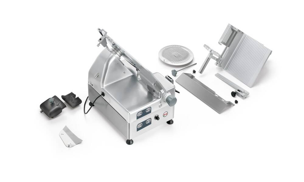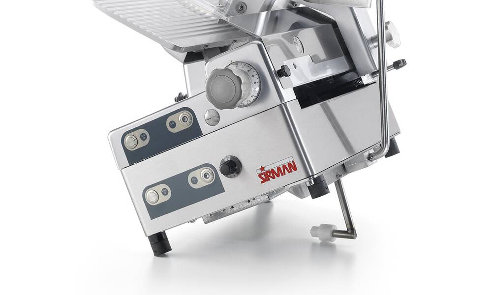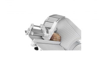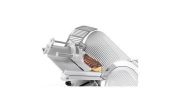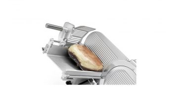 Nářezový stroj PALLADIO AUTOMEC 300 s nerezovým nožem o průměru 300 mm s uložením posuvného stolu našikmo, od italského výrobce SIRMAN.- vhodný do velkých restaurací, jídelen a supermarketů