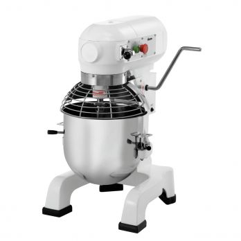 Kuchyňský robot až na 7,5 kg těsta. Mixovací nádoba objemu 20 litrů na přípravu těst, smetany, krémů atd. Odnímatelná míchací mísa z nerezové oceli. Produkční množství těsta 7,5 kg / 20 litrů. Regulace rychlosti 3 úrovně. Bezpečnostní spínač. Včetně: 1 plochý šlehače nerez, 1 hnětací hák na těsto nerez, 1 metla nerez/litý hliník, 1 ochranná mřížka, nerez. Příslušenství vhodné do myčky nádobí. Ochrana motoru. Materiál lakovaná nerezová ocel. Příkon 1,1 kW / 230 V / 50 Hz. Rozměr: Š 530 x H 496 x V 800 mm. Hmotnost: 80,18 kg.
