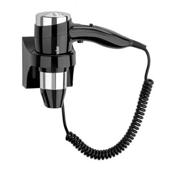 Bez zásuvky na holicí strojek. Hlavní vypínač na nástěnném držáku. On/of na rukojeti. Černý design, spirálový kabel. Montáž na stěnu. Materiál černý plast. 3 stupňová regulace vzduchu, studený vzduch. Délka kabelu 1 - 2,5 m. Včetně upevňovacího materiálu, nástěnného držáku. Příkon 1,6 kW / 230 V. Rozměr Š 260 x H 125 x V 205 mm. Hmotnost 0,7 kg.