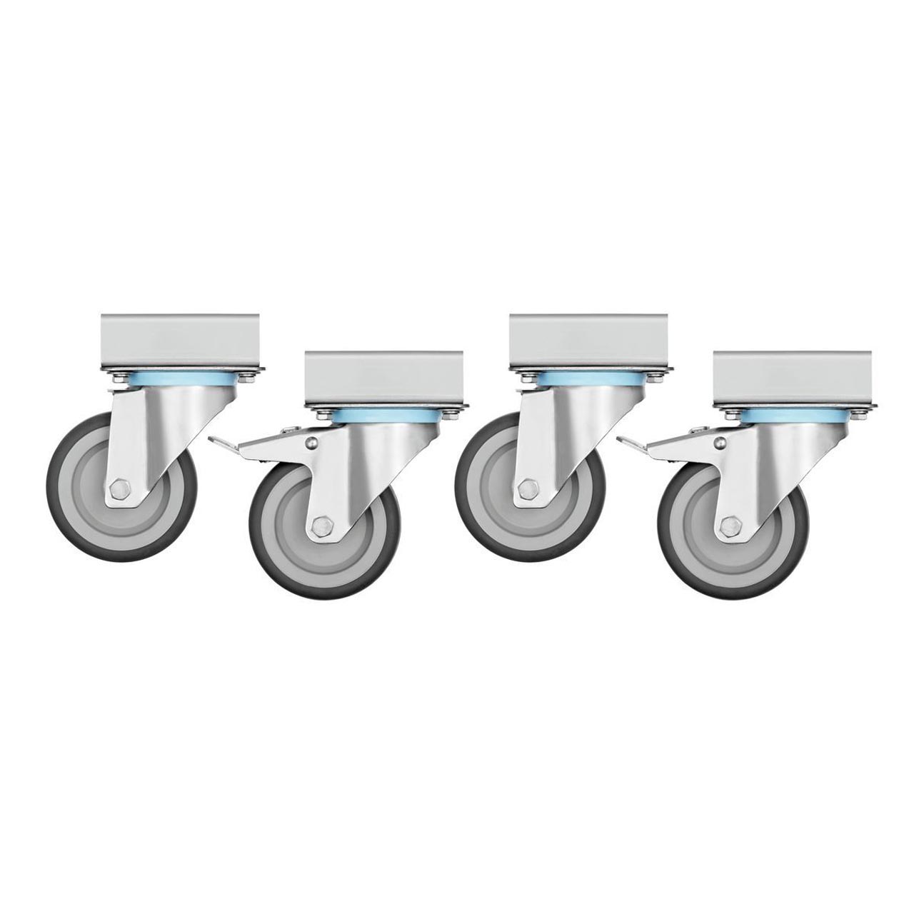 Otočná kolečka, z toho 2 uzamykatelná. Nosnost kolečka max. 100 kg/1 kus. Průměr 100 mm. Materiál plast, pogumovaný. Rozměr: Š 85 x H 70 x V 121 mm. Hmotnost 2,91 kg.