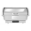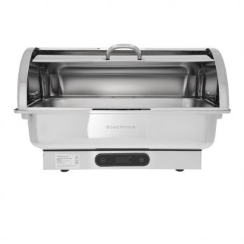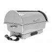 Elektrický chafing na servírování potravin s digitálním displejem, možnost nastavení teploty od 30°C do 100°C. Topné těleso je pod vanou, proto se na něm nebude usazovat vodní kámen. Víko je odklápěcí s masivním úchytem - provedení roll-top. Součástí je gastronádoba GN 1/1 o hloubce 65 mm. Úchyty ulehčují přenášení, gumové nožky zabraňují klouzání chafingu. Příkon 0,8 kW.