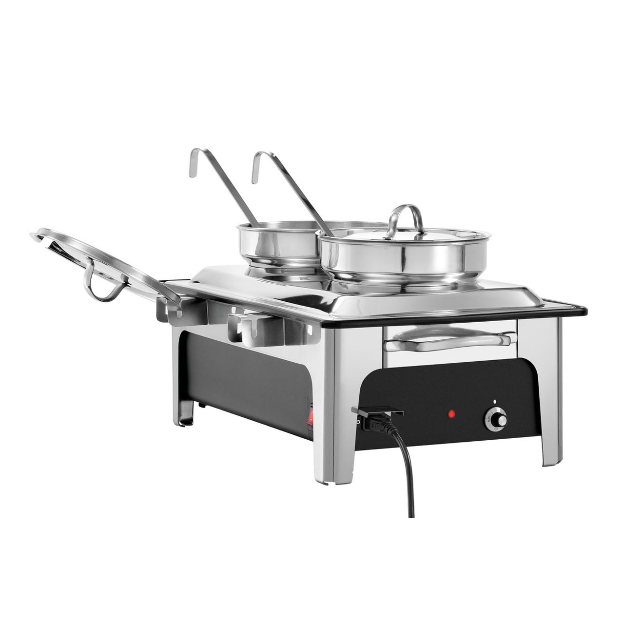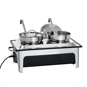 Elektrický chafing dish pro teplé polévky.Dva hrnce - 2 x 4 litry. Vyroben z chromniklové oceli, černá plastová vana na vodu. Příkon: 2,2 kW/230 V. Rozměry: 636 (Š) x 357 (H) x 460 (V) mm. Hmotnost: 6,6 kg. Součástí: držák na víko + 2 naběračky.