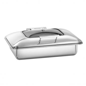 Materiál ušlechtilá ocel, otvor z plexiskla. Objem 8,5 litrů. Vnitřní regulace teploty pomocí zabudované varné desky pro indukční nebo sklokeramický ohřev. Včetně gastronádoby GN 1/1 - 65 mm. Chafing není stohovatelný. Hydraulické otvírání víka, jednoduché vyjmutí gastronádoby. Rozměr: Š 580 x H 420 x V 205 mm. Hmotnost: 7 kg. K použití zařízení je nutná externí varná deska.