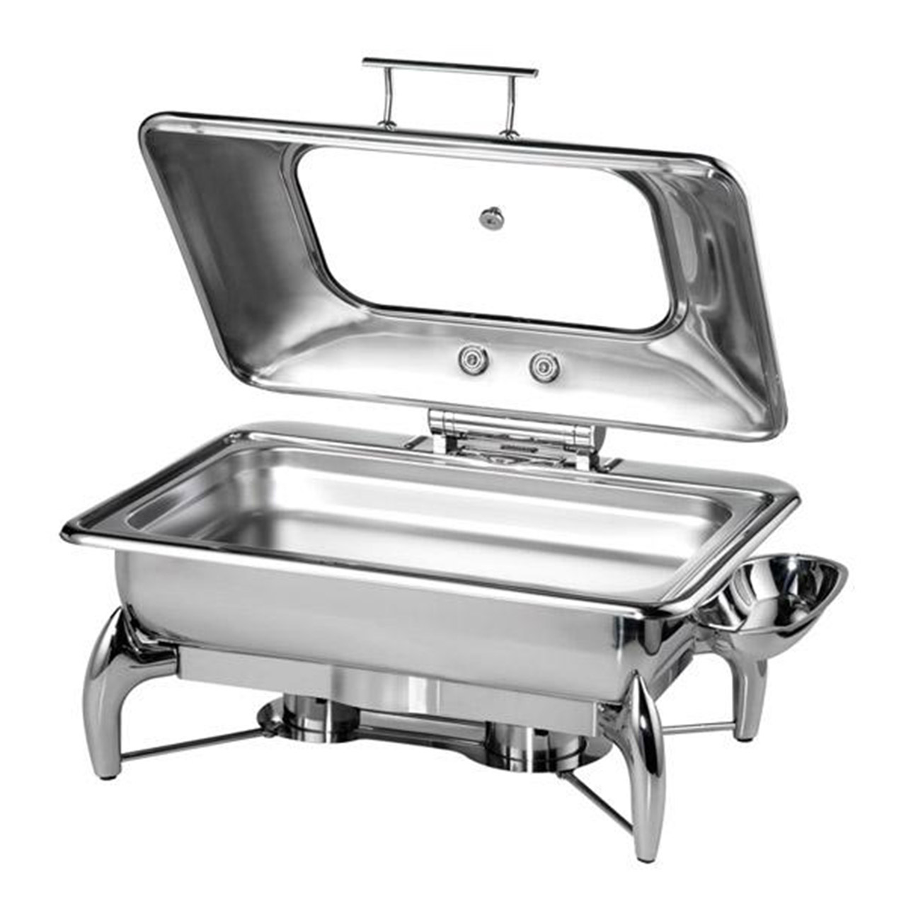 Chafing dish z ušlechtilé nerezové oceli vhodný na indukci. Víko se skleněným průzorem. Chafing s vodní lázní se sendvičovým dnem a gastronádobou GN 1/1 o hloubce 65 mm a objemu 9 l. Součástí dvě nádoby na hořlavou pastu, připevněná miska na odkládání lžíce. Součástí dodávky rám pro upevnění indukční plotýnky.
