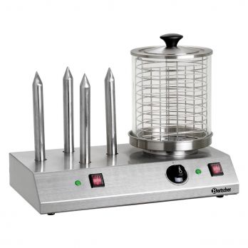 Ohřívač párků se 4 speciálními trny na rohlíky. Nerezová potravinářská ocel. Skleněný válec: průměr 200 x 240 (V) mm. Regulace teploty od 40 do 100 °C. Příkon: 0,96 kW/230 V. Rozměry: 500 (Š) x 285 (H) x 390 (V) mm. Hmotnost: 2,75 kg.