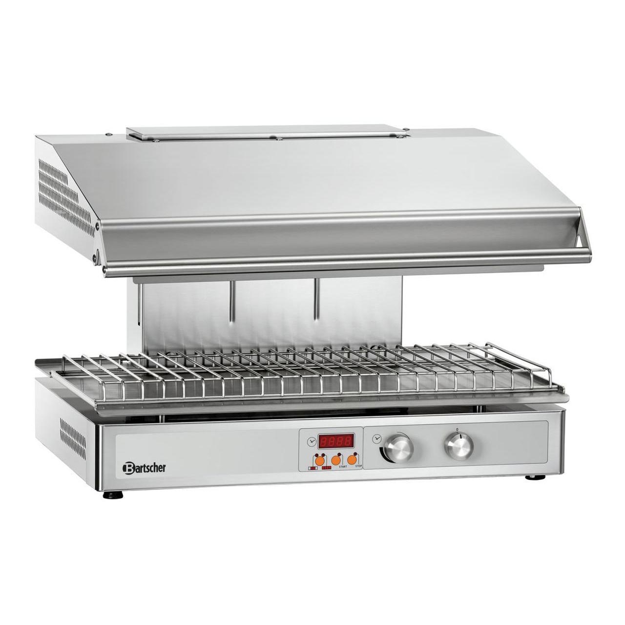 Elektrický se 4 topnými tělesy, z nerezové oceli, výškově nastavitelný topný prvek. Samostatně regulovatelné 2 topné zóny. Miska pro zachycení tuku a grilovací rošt (737 (Š) x 355 (H) mm). Manuální nastavení času, digitální ukazatel. Včetně upevňovací konsole. Příkon: 6 kW/380-400 V. Rozměry: 745 (Š) x 590 (H) x 515 (V) mm. Hmotnost: 70,6 kg.