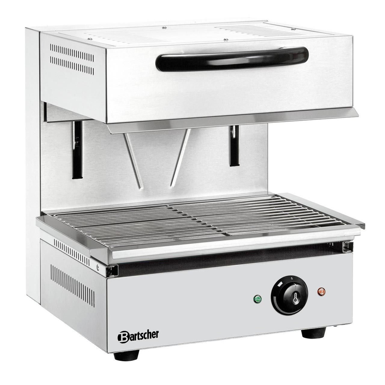 Skříň z nerezové oceli, infračervené topné těleso, výškově nastavitelný topný prvek, kontrolka, reostat, grilovací rošt 445 (Š) x 325 (H) mm, miska pro zachycení tuku. Příkon: 2,8 kW/230 V. Rozměry: 470 (Š) x 525 (H) x 535 (V) mm. Hmotnost: 38,8 kg.