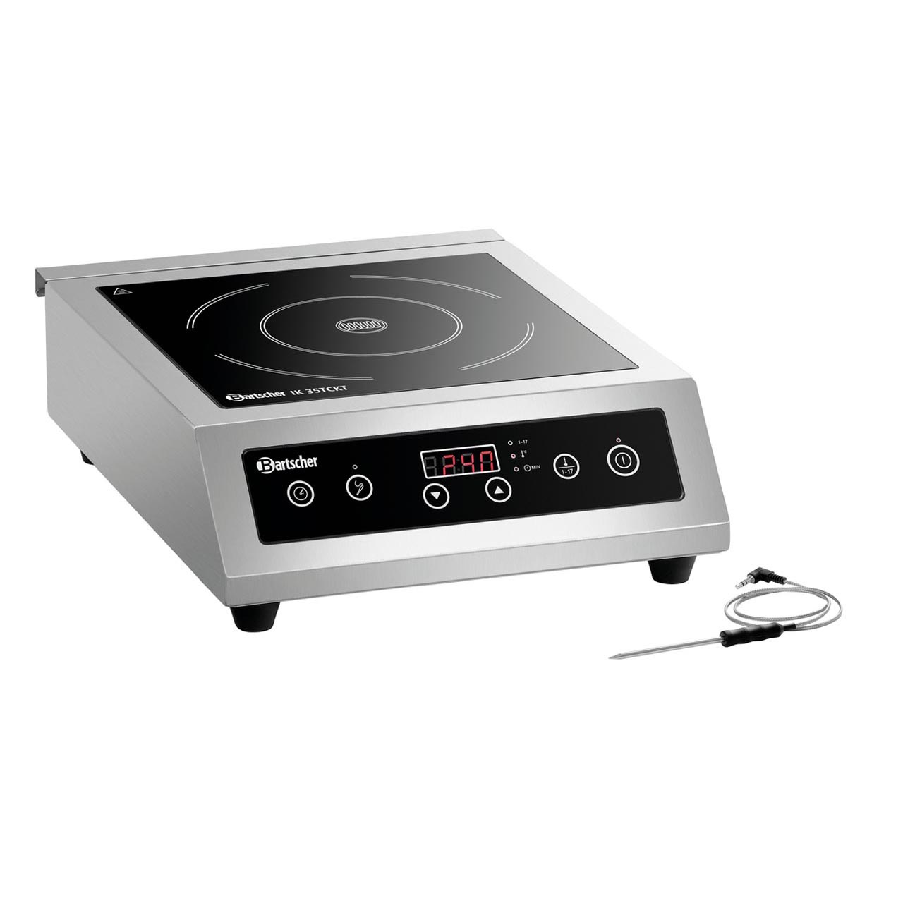 Indukční vařič, průměr varné desky 240 mm / max. 3500W. Rozměr skleněné desky Š 285 x H 285 mm. Nastavení času od 1-180 min. (á 1 minuta). Časovač, teplotní rozmezí 60-240 °C, 10 teplotních úrovní (interval 20°C). Příkon 3,5 kW / 230 V. Připraveno k zapojení. Řízení dotykové/elektronicky. 1 plotýnka indukční. Kontrolka světla zap/vyp, výkonu, teploty, času. Materiál ušlechtilá ocel / sklo. Ochrana proti přehřátí. Digitální ukazatel. Sonda teploty jádra, délka kabelu 50 cm, držák sondy. Detekce nádobí. 17 výkonnostních stupňů. Tukový filtr. Rozměr: Š 340 x H 430 x V 120 mm. Hmotnost 7,3 kg.
