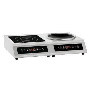 Stolní indukční sporák se 2 plotýnkami, jedna na WOK pánve. Obě plotýnky lze zapínat nezávisle na sobě,ať už jde o výkon 3500 W, nebo o časovač. Typ varných desek indukce Počet plotýnek 1 x indukční vařič + 1x indukční wok Uspořádání varných zón vedle sebe Rozměr skleněné tabule: Š 285 x H 285 mm Průměr indukční plochy 240 mm, výkon 3,5 kW Průměr indukčního wok 270 mm, výkon max. 3,5 kW Regulace výkonu, teploty, času Počet úrovní výkonu 17 Teplotní rozsah 35° do 240 °C Počet teplotních úrovní 205. Nastavení intervalů teploty 1 °C Časovač. Nastavení času 1 až 180 minut Detekce hrnce. Digitální displej. Ochrana proti přehřátí. zapnutí/vypnutí = 1 spínač/zařízení Kontrolka: zap/vyp, výkonu, teploty času Ovládání elektronické, dotykem Materiál: nerezová ocel Důležitá poznámka: Jsou zapotřebí 2 samostatné zásuvky Příkon: 7 kW / 230 V / 50Hz. Připojení zařízení 2 x 1 NAC Rozměr: Š 680 x H 435 x V 145 mm Hmotnost 11,87 kg