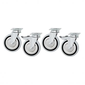 Kolečka pro možnost zajištění mobilní ohřívací skříně 700 B1000 až B2000. Materiál nerezová ocel a guma. 4 kolečka, z toho 2 bržděná. Průměr koleček 125 mm. Nosnost á 150 kg/kolečko. Rozměr: Š 75 x H 140 x V 160 mm. Hmotnost 2,6 kg.