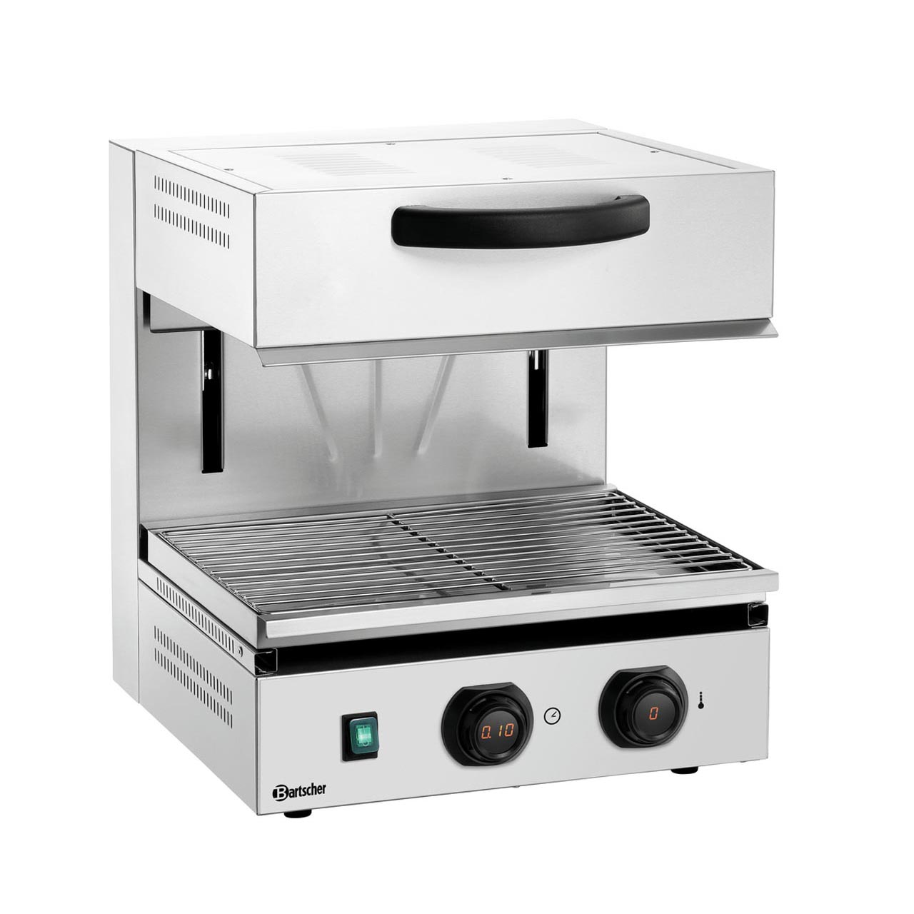 Elektrický salamander na udržování teploty jídel. Výškově nastavitelné topné těleso s infračerveným ohřevem. Materiál nerezová ocel. Tepelný výkon lze regulovat pomocí funkce lift i přesným digitálním nastavením teploty a času. Funkce paměti a akustický signál po uplynutí času zajišťují optimalizované pracovní postupy. Zařízení připraveno k zapojení. Ovládání pomocí MDI knoflíku. Zdroj tepla sálavé topení, 1 topné těleso výškově nastavitelné, 1 topná zóna Grilovací rošt: Š 435 x H 320 mm Manuální nastavení času, nádoba na sběr tuku Elektronická regulace energie, digitální displej Přepínač ovládání MDI, kontrolka topení, kontrolka ZAP/VYP Funkce: ECO režim: úspora energie při udření teploty potravin; odnímatelný grilovací rošt; přepínání s digitálním displejem pro teplotu a čas; funkce paměti; pípnutí po uplynutí času (0:10 - 9:30 minut) Dodáváno včetně 1 roštu Příkon: 2,8 kW / 230 V / 50/60 Hz Rozměr: Š 462 x H 515 x V 532 mm Hmotnost 33,8 kg