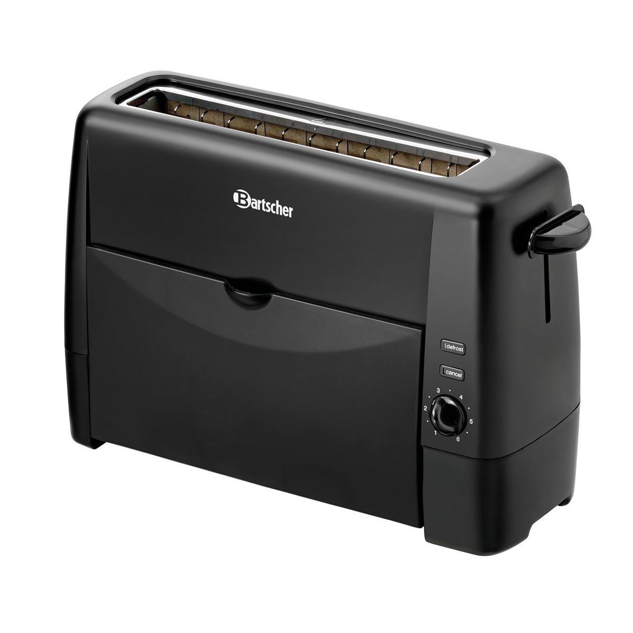 Toaster Bartscher TS20Sli je velmi praktický a bezpečný. Hotové, opečené toasty samy propadnou do zabudované podložky. Toaster je vyroben z černého plastu. Funkce pečení a rozmrazování. 6 úrovní opékání. Kontrolka ON/OFF, tlačítko "cancel" pro zrušení opékání, kontrolní světlo.