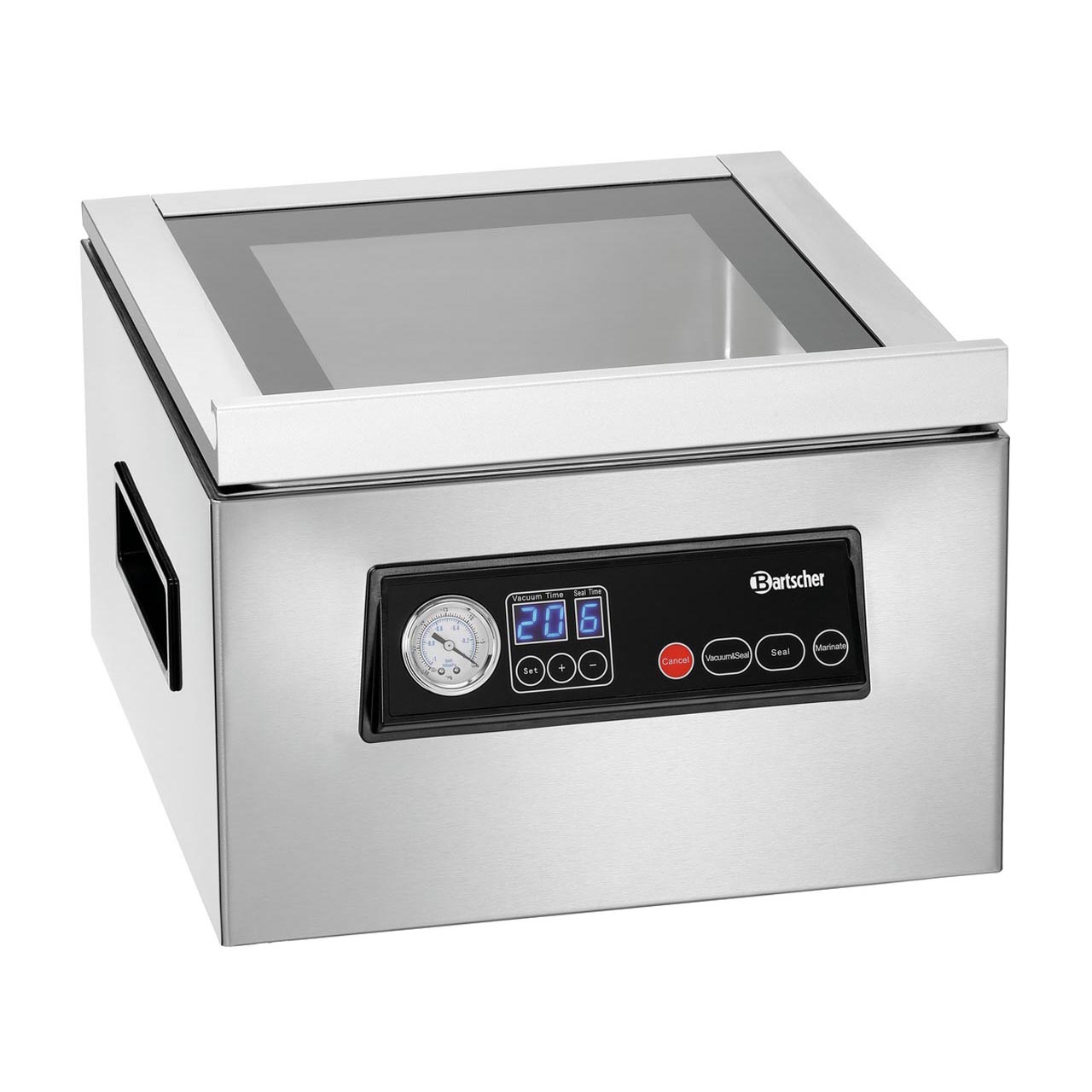 Komorová vakuovačka se skleněným víkem. Manometr pro sledování vakua. Upínací držák v komoře zabraňuje sklouznutí vakuových sáčků. Obsahuje 30 vakuových sáčků (280 x 330 mm). Barva stříbrná, černá. Materiál nerez, plast, sklo. rozměry komory: Š 305 x H 320 x V 90 mm ovládání elektronické, digitální displej, vypínač indikátor: kombinované vysávání a utěsňování, těsnění marinování, zap/vyp, zrušení 2 sváry, délka svařovacího drátu 300 mm vakuovací pumpa: 60 l / min. (cca 4 m3 / hod); ovládání vakua časované nastavitelná intenzita vakuování, max. vakuum -900 mbar nastavitelná doba svařování 3 - 9 sekund vlastnosti: doba vakuování: 20 - 99 sekund, zobrazení tlaku manometrem, upínací držák pro vakuové sáčky funkce: kombinované vysávání a uzavírání, ruční svařování, marinování Příkon: 0,35 kW / 230 V / 50 Hz Rozměr: Š 375 x H 440 x V 271 mm Hmotnost: 15,1 kg