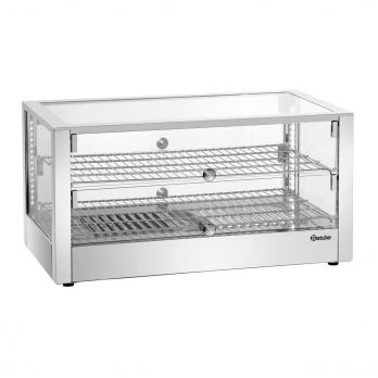 Vyhřívaná vitrína Bartscher 6200 2EK je vyrobena z nerezové oceli a bezpečnostního skla, pochromované rošty. Oboustranné otevírání s praktickými dvířky a LED osvětlením. Vnitřní rozměry vitríny 620 x 340 mm (Š x H). Teplotní rozsah vitríny od 30 do 90 °C. Objem 80 litrů. Plynulá regulace teploty, vnitřní LED osvětlení, kontrolka ON/OFF, ovládací otočný knoflík, výklopné zadní dveře se zámkem. Vytápění horkým vzduchem, zvlhčování pomocí odpařovací misky. Rozměr: Š700 x H 430 x V 365 mm, hmotnost: 17,4 kg.