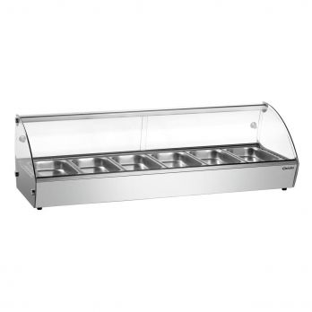 Vyhřívaná vitrína Bartscher R6 pro 6 gastronádob GN 1/3 o hloubce max. 40 mm. Vitrína je vyrobena z nerezové oceli a bezpečnostního skla. Teplotní rozsah od 30 do 90 °C. Objem 68 litrů. Posuvná zadní otevírací dvířka, plynulá regulace teploty, zaoblené čelní sklo, ovládací otočný knoflík, kontrolka ON/OFF. Vytápění horkým vzduchem, zvlhčování pomocí odpařovací misky.
