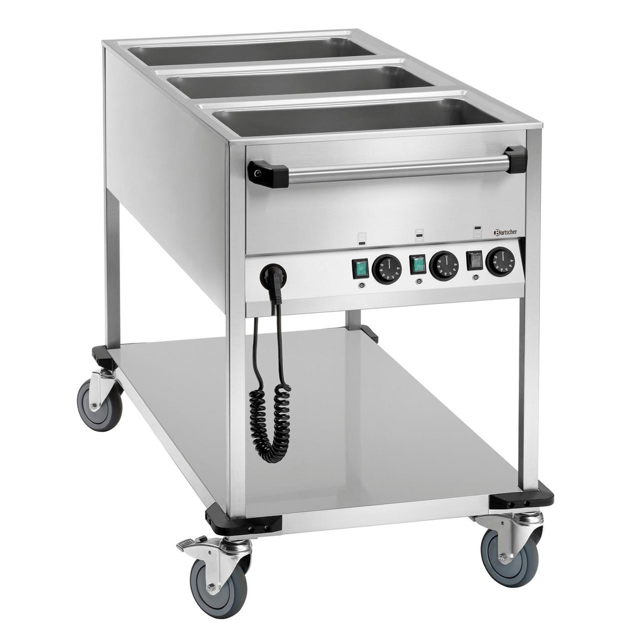 Bartscher - Pojízdná vodní lázeň z chromniklové oceli 18/10. Teplotní rozsah: od 30 ° C až 90 ° C. Pro 3 gastronádoby GN 1/1-200 mm. Topné zóny samostatně regulovatelné, plynulá regulace teploty. Vypínač s kontrolkou zapnutí/vypnutí. 4 otočná kolečka o pr. 125 mm (z toho 2 bržděná). Rozměr spodní police Š 600 x H 1135 x V 370 mm. Délka kabelu 1,7 m. Dodáváno bez gastronádob! Příkon: 2,1 kW/230 V. Rozměry: 655 (Š) x 1300 (H) x 910 (V) mm. Hmotnost: 54 kg.