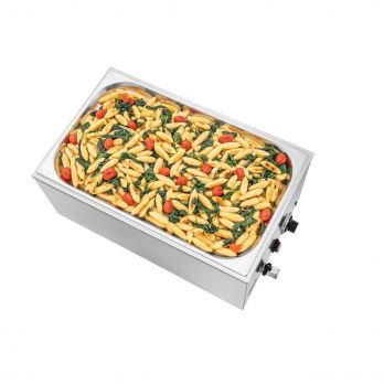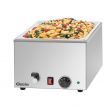 GN 1/1, hloubka 150 mm. Nerezová vodní lázeň slouží k udržování pokrmů při výdeji. Vyrobená z potravinářské nerezové oceli 18/10. Regulace teploty: 30 až 90 °C. Vypínač pro zapnutí a vypnutí. Zelená kontrolka, kterou sledujete její vyhřátí. Topné těleso pod dnem vany. Příkon: 1,2 kW/230 V. Rozměry: 340 (Š) x 590 (H) x 240 (V) mm. Hmotnost: 7,5 kg. .