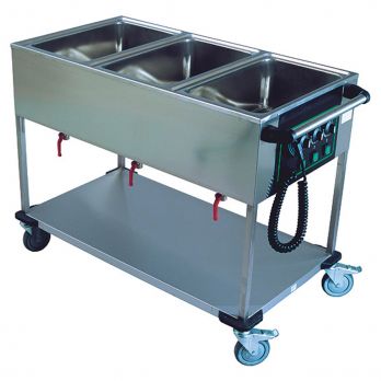 Jídelní výdejní vozík vyrobený z chromniklové oceli 18/10. Ovládání vozíku na krátké straně - čelní. Jednotlivé vany jsou určeny pro výdej z gastronádob 1/1 gastronormy, popř. menších. Hloubka GN může být až 200 mm. Každá vana disponuje samostatným vyhříváním topným tělesem a samostatným termostatem pro regulaci teploty lázně až do +90 °C. Napájení vozíku je 230 V~50 Hz. Přívod je zajištěn točeným kabelem o max. dosahu 2 m. Rozměr (mm): 1210×650×900 Počet vyhřívaných lázní: 3 Příkon (kW): 2,1 Kolečka: 4 otočná pr. 125 mm, z toho 2 s brzdou Hmotnost (kg): 46