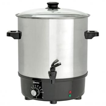 Zavařovací hrnec i hrnec na svařené víno Bartscher je vyrobený z kvalitní ušlechtilé nerezové oceli. Spodní podstavba, kohout a rukojeti jsou z kvalitní umělé hmoty. Víko skleněné s umělohmotnou rukojetí. Dodáváme včetně jednoho roštu o průměru 32 cm. Objem: 25,0 litrů. Regulovatelný termostat od 30 °C do 100 °C. Příkon/napětí všech druhů: 2,0 kW/230 V. Rozměry: PR 450 mm, V 470 mm. Hmotnost: 6,1 kg.