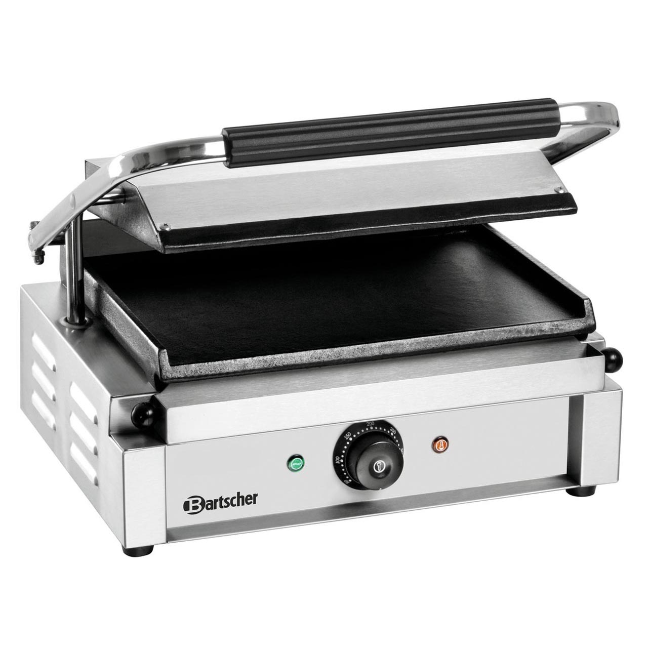 Elektrický kontaktní gril. Robustní konstrukce z nerezové oceli. Litinová deska pro optimální přenos tepla. Samostatný termostat 50 až 300 °C. Kontrolka ohřevu; kontrolka zapnuto/vypnuto. Odkapávací miska. Příkon: 2,2 kW/230 V. Rozměry: 410 (Š) x 370 (H) x 200 (V) mm; rozměry horní grilovací desky: 335 (Š) x 220 (H) mm, rozměry dolní grilovací desky: 335 (Š) x 230 (H) mm. Hmotnost: 19 kg.