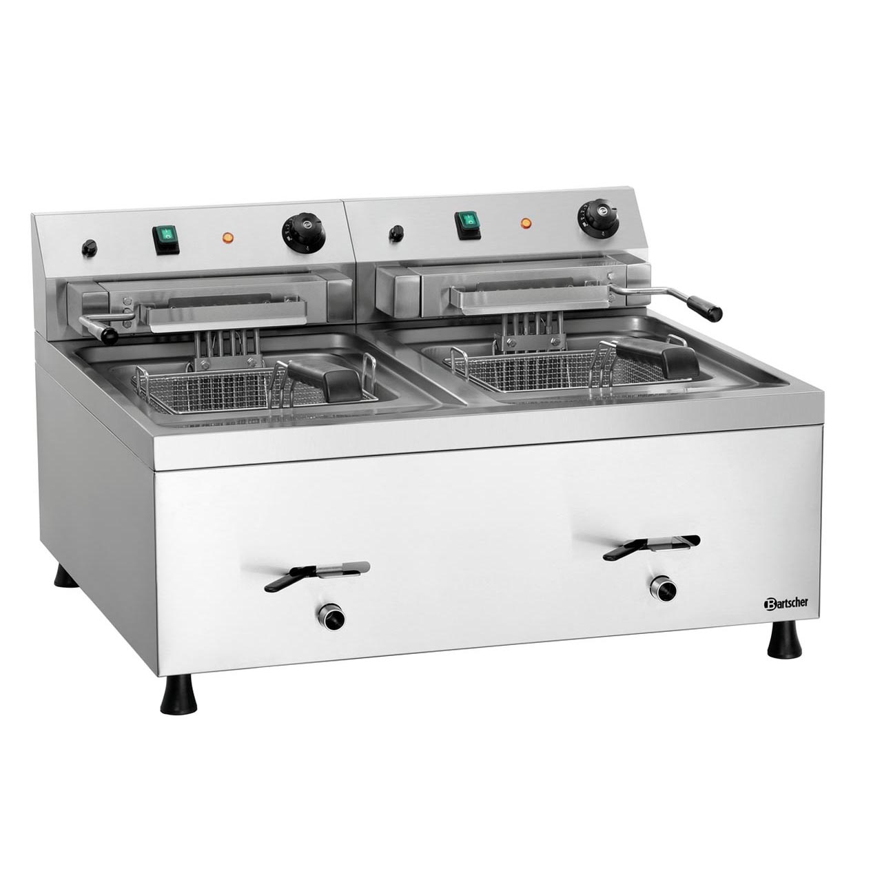 Stolní elektrická fritéza s vanou 2 x 12 litrů. Poklice, vypouštěcí kohout tuku. Vyjímatelný koš, síto na strouhanku a nerezové výklopné topné těleso pro snadné čištění. Studená zóna, bezpečnostní termostat, teplotní rozpětí od 50 do 190 °C, regulace manuálně. Kontrolka ON/OFF, zahřátí, ZAP/VYP. Příkon 18 kW / 400 V / 50 Hz / 3 NAC. 2 koše Š 250 x H 230 x V 110 mm objemu á 6,5 litrů. 2 vany Š 290 x H 308 x V 210 mm objemu á 12 litrů. Rozměr: Š 800 x H 650 x V 485 mm. Hmotnost 28,8 kg.