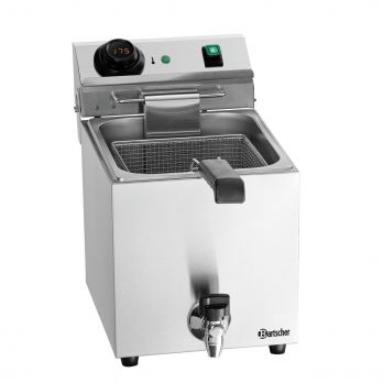Stolní elektrická fritéza určená pro rychlá občerstvení a menší gastro provozy. Topné těleso z nerezové oceli lze vyklopit. Zařízení připojené k provozu. 1 x koš: Š 210 x H 220 x V 120 mm; obsah 5,5 litrů 1 vana, Š 240 x H 300 x V 200 mm; obsah 9 litrů Studená zóna, bezpečnostní termostat, kohout na vypouštění tuku, digitální displej, teplotní rozsah od 50 až 190 °C, regulace teploty elektronické , v krocích po 1 °C. Kontrola teploty oleje - aktuální teplotu lze kdykoli vyvolat, kontrolka dosažené teploty oleje. Manuální ovládání, digitální knoflík MDI, vypínač ON/OFF. Světelné značení: zahřátí, zap/vyp, připraveno k provozu, dosažená teplota. Materiál nerezová ocel. Vhodné pro smažení oleje a tuku (blokový tuk. Včetně 1 koše a víka. Příkon: 3,3 kW. / 230 V. Rozměr: Š 285 x H 610 x V 387 mm. Hmotnost 6,4 kg.