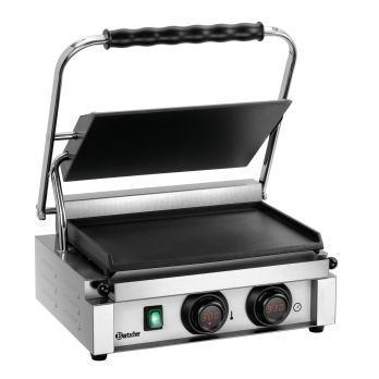 Kontaktní gril s hladkými grilovacími deskami .Kontaktní gril s digitálním displejem, časovačem a signalizací. Elektronická regulace teploty, rozsah od 50 do 300 °C. Signalizace po uplynutí nastavené doby, kontrolka ohřevu; kontrolka zapnuto/vypnuto, manuální řízení. Materiál ušlechtilá ocel, smaltované litinové desky. Včetně čistícího kartáče a odkapávací misky pro zachycení tuku. Příkon: 2,2 kW / 230 V/ 50/60 Hz. Rozměry: 410 (Š) x 400 (H) x 200 (V) mm. Rozměry horní grilovací desky: 340 (Š) x 220 (H) mm, rozměry dolní grilovací desky: 360 (Š) x 285 (H) mm. Hmotnost: 18,1 kg.