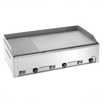 Elektrická grilovací deska s hladkou a rýhovanou plochou. 3 samostatně regulovatelné zóny. Součástí 2 čisticí škrabky, 4 umělohmotné nožičky, nádoba na zachycení tuku. Ochrana proti stříkající vodě pevně svařená. Materiál CNS 18/10. Teplotní rozhraní 50 °C a 300 °C. Světelná kontrolka zap/vyp Rozměr pracovní plochy: Š 980 x H 480 mm; materiál ocel; 2/3 hladká, 1/3 dýhovaná. Příkon: 9 kW / 400 V, rozměr celkem: Š 990 x H 535 x V 290 mm, hmotnost: 70 kg.