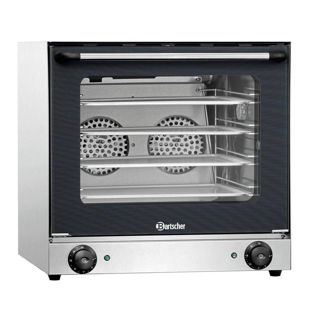 Bartscher - Horkovzdušná trouba z nerezové oceli, emailový varný prostor. Manuální nastavení teploty a času. Dodáváno včetně 4 plechů. Parametry: 4 vsuvy, prostor mezi vsuvy 70 mm. Spínač teploty: 50-300 °C, spínač času: 0-120 minut, dvířka s dvojitým sklem, funkce: horký vzduch, 2 motory. Příkon: 2,7 kW / 230 V. Rozměry: 595 (Š) x 615 (H) x 580 (V) mm. Hmotnost: 38 kg.