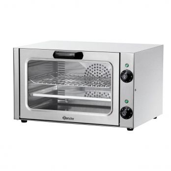 Horkovzdušná trouba i pečicí komora z ušlechtilé oceli s funkcí horký vzduch. Součástí rošt a pečicí plech. Parametry: - teplotní rozsah 50-250 °C, termostat, nastavení teploty od 0-120 minut (cca 6 minut na 163 °C), časovač, 4 vstuvy, rozměr mezi vsuvy 55 mm, elektronická regulace. Vnitřní rozměr: Š 404 x H 308 x V 254 mm Příkon: 2,5 kW / 230 V 50/60 Hz Rozměr: Š 530 x H 495 x V 320 mm Hmotnost: 17,5 kg