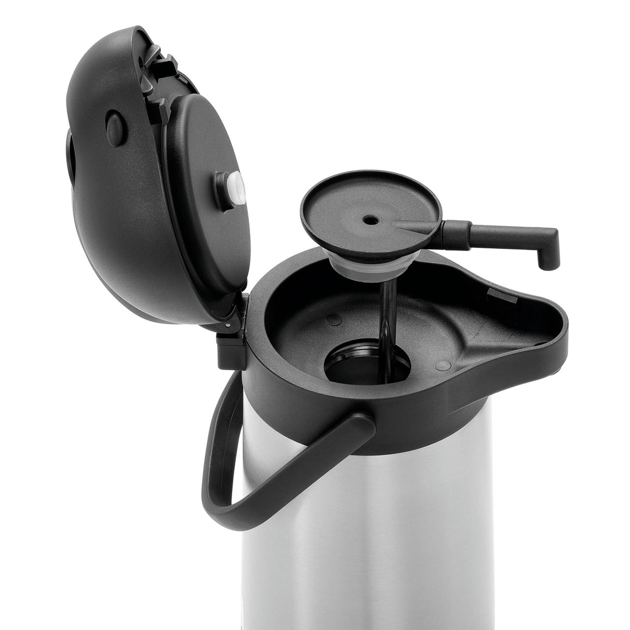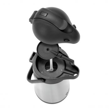 Konvice z nerezové potravinářské oceli a z černého odolného plastu, perfektní dávkování. Dvojitá izolovaná stěna pro bezpečnou dopravu. Hlava pro snadné plnění a čištění. Kapacita: 1,9 litrů. Rozměry: pr. 150 mm, 390 (V) mm. Hmotnost: 1,3 kg. Spodní část s integrovaným kroužkem pro otočení konvice o 360 stupnů.