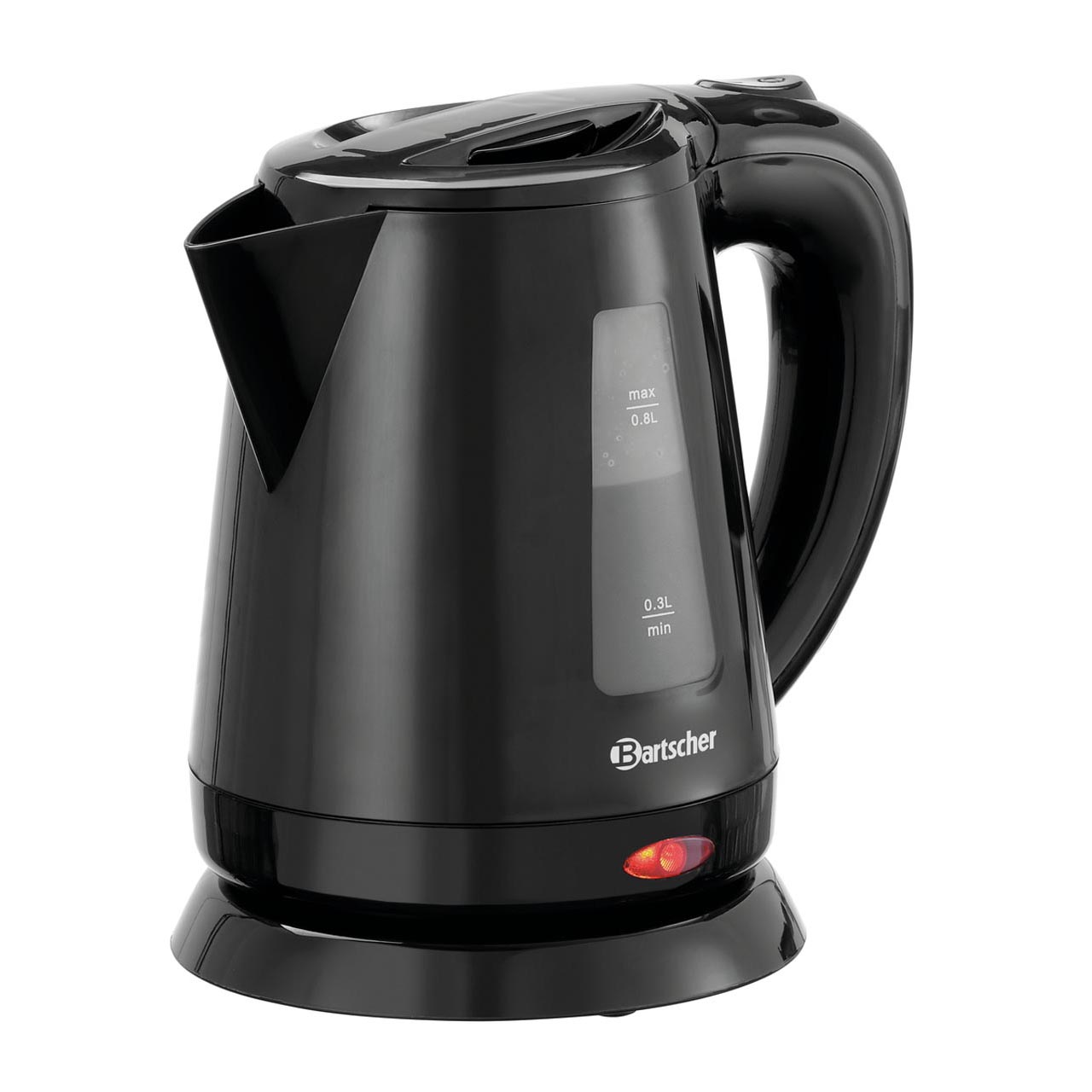 Rychlovarná konvice objemu 0,8 litrů pro menší kuchyňky, hotelové pokoje aj. Materiál odolný plast, barva černá, lesklá. Minimální ohřev pro 0,3 litry. Teplota až do 100 °C. Automatické vypnutí, filtr vodního kamene vyjímatelný, ukazatel naplnění, ochrana proti použití na sucho, praktická rukojeť. Délka kabelu 70 cm. Kontrolka provozu. ZAP/VYP. Vlastnosti: Rychlovarná konvice odnímatelná od základny, bezdrátová. 360° kontaktní připojení. Bezpečná rukojeť pro přenášení. Zakryté topné těleso. Příkon: 1,2 kW / 230 V. Rozměr: Š 140 x H 200 x V 195 mm. Hmotnost 0,654 kg.
