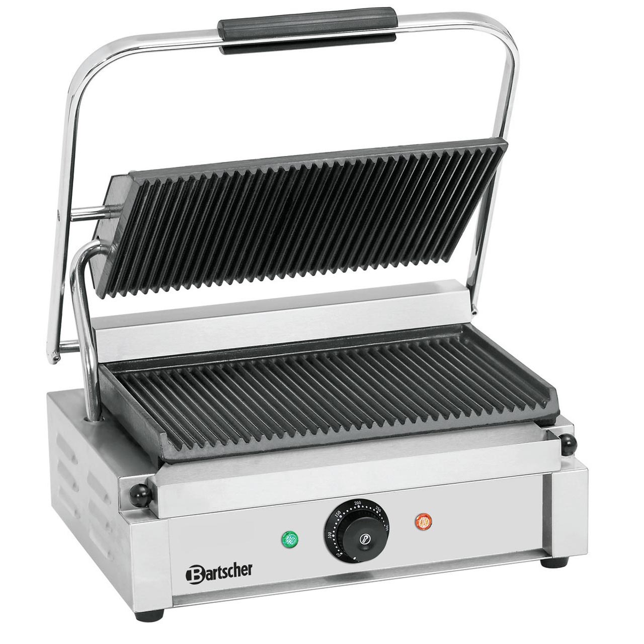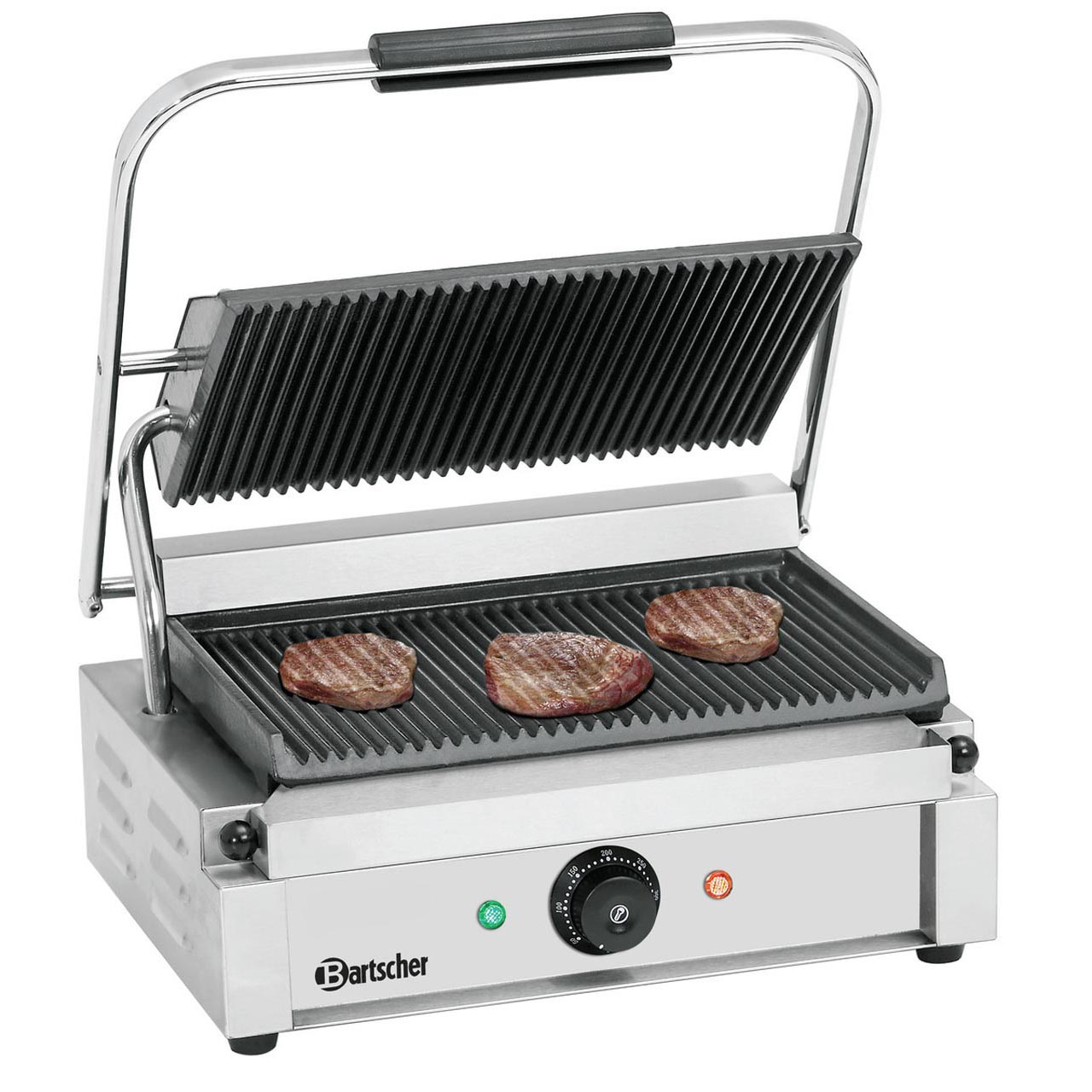 Grilovací desky rýhované. Robustní konstrukce z nerezové oceli. Litinová deska pro optimální přenos tepla. Samostatný termostat 50 až 300 °C. Kontrolka ohřevu; kontrolka zapnuto/vypnuto. Odkapávací miska. Příkon: 2,2 kW/230 V. Rozměry: 410 (Š) x 400 (H) x 200 (V) mm; rozměry horní grilovací desky: 335 (Š) x 220 (H) mm, rozměry dolní grilovací desky: 335 (Š) x 230 (H) mm. Hmotnost: 18,7 kg. Dodáváno včetně čistícího kartáče.