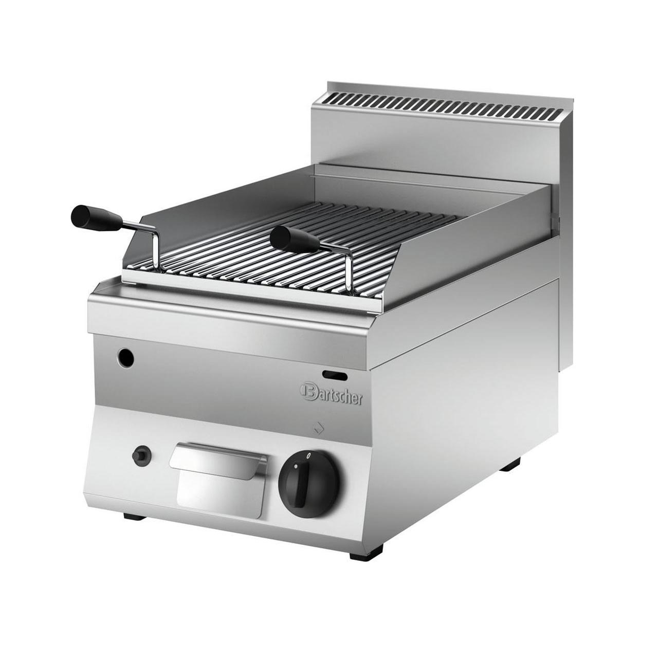 Stolní lávový gril řady 650 Bartscher z chromniklové oceli 18/10. Rozměr Š 400 x H 650 x V 295, příkon 7 kW. Na propan-butan, trysky na zemní plyn jsou přiloženy. Rozměr grilovací plochy 330 x 580 mm. 1 topná zóna, 1 grilovací plocha, piezo zapalování. Součástí lávové kameny pro první použití, miska na odkapávání tuku, ochrana proti stříkající vodě. Plnicí množství lávovými kameny 6kg. Hmotnost 36 kg.