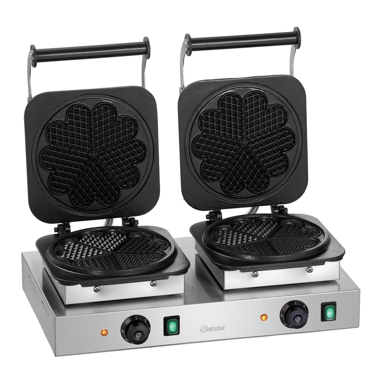 Vaflovač dvojitý s pečicí deskou ve tvaru srdce, pevně připojenou. Nerezové provedení. Velikost desky: 2 x pr. 210 mm, výška 16 mm. Termostatická regulace teploty: 50 - 300 °C. Příkon: 2 x 2,2 kW/2 x 230 V. Rozměry: 600 (Š) x 470 (H) x 220 (V) mm. Hmotnost: 31,1 kg. Včetně čistícího kartáčku. Snadná montáž.