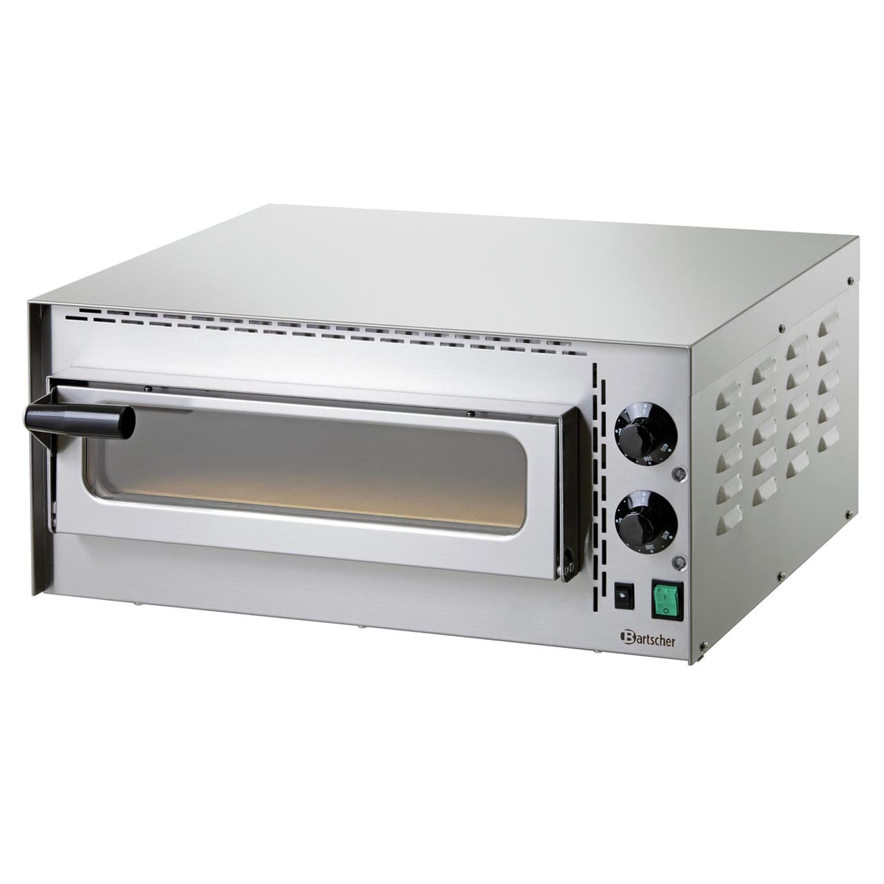 Jednopatrová pec na pizzu z nerezové potravinářské oceli vně i uvnitř. 1 pizza o pr. 35 cm. Horní a spodní ohřev. Regulace teploty: do 400 °C. Vnitřní osvětlení, časovač. Příkon: 2,0 kW / 230 V. Rozměry pečící komory: 410 (Š) x 370 (H) x 90 (V) mm. Dno pece z tepelně odolného kamene. Rozměry: 575 (Š) x 525 (H) x 270 (V) mm. Hmotnost: 27,2 kg.