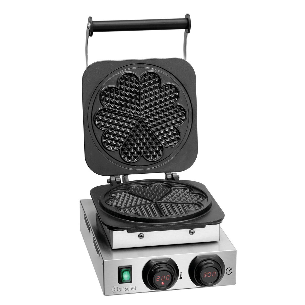 Litinové plechy trvale namontované, tvar Srdce, průměr vafle 210 mm, výška 16 mm. Robustní konstrukce, vysoký výkon a jednoduché a intuitivní manuální ovládání s digitálním displejem, časovačem a akustickým signálem. Materiál nerezová ocel. Teplotní rozmezí od 50 do 300 °C, elektronická regulace teploty po 1 °C, manuální ovládání. Kontrolka zahřívání, signalizace uplynutí času (0 - 9:30 minut). Příkon: 2,2 kW / 230 V / 50/60 Hz.Rozměr: Š 285 x H 470 x V 225 mm.Hmotnost: 17,0 kg.