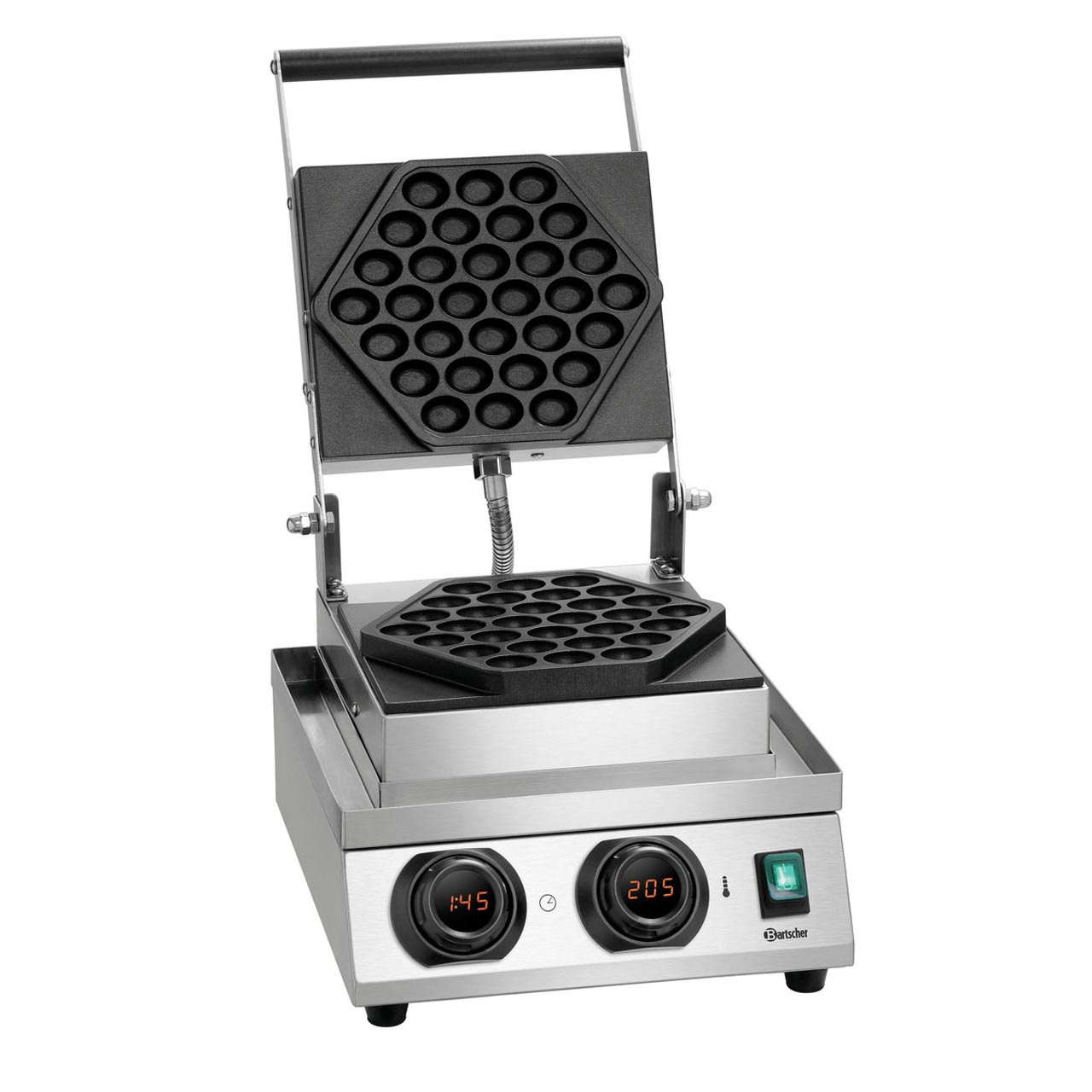 Vaflovač na pravé bubble vafle. Tělo vaflovače z nerezové oceli. Hliníkové plotýnky na opékání s obou stran s nepřilnavým povrchem jsou pevně namontované a nejsou otočné. Teplotní rozhraní: od 50 do 300 °C, elektronická regulace teploty v 1 °C-krocích, ovládání MDI-knoflíkem, digitální ukazatel, časovač, ochrana IPX3; kontrolka zahřátí, ZAP/VYP, knoflík s digitálním ukazatelem teploty a času; Memory-funkce, signalizace uplynutí času (0:10 – 9:30 minut). Velikost vaflí Š 207 x 176 (šestihranné). Včetně odkapávací misky. Příkon: 1,5 kW / 230 V / 50 Hz Rozměr: Š 300 x H 410 x V 255 mm Hmotnost: 9,8 kg