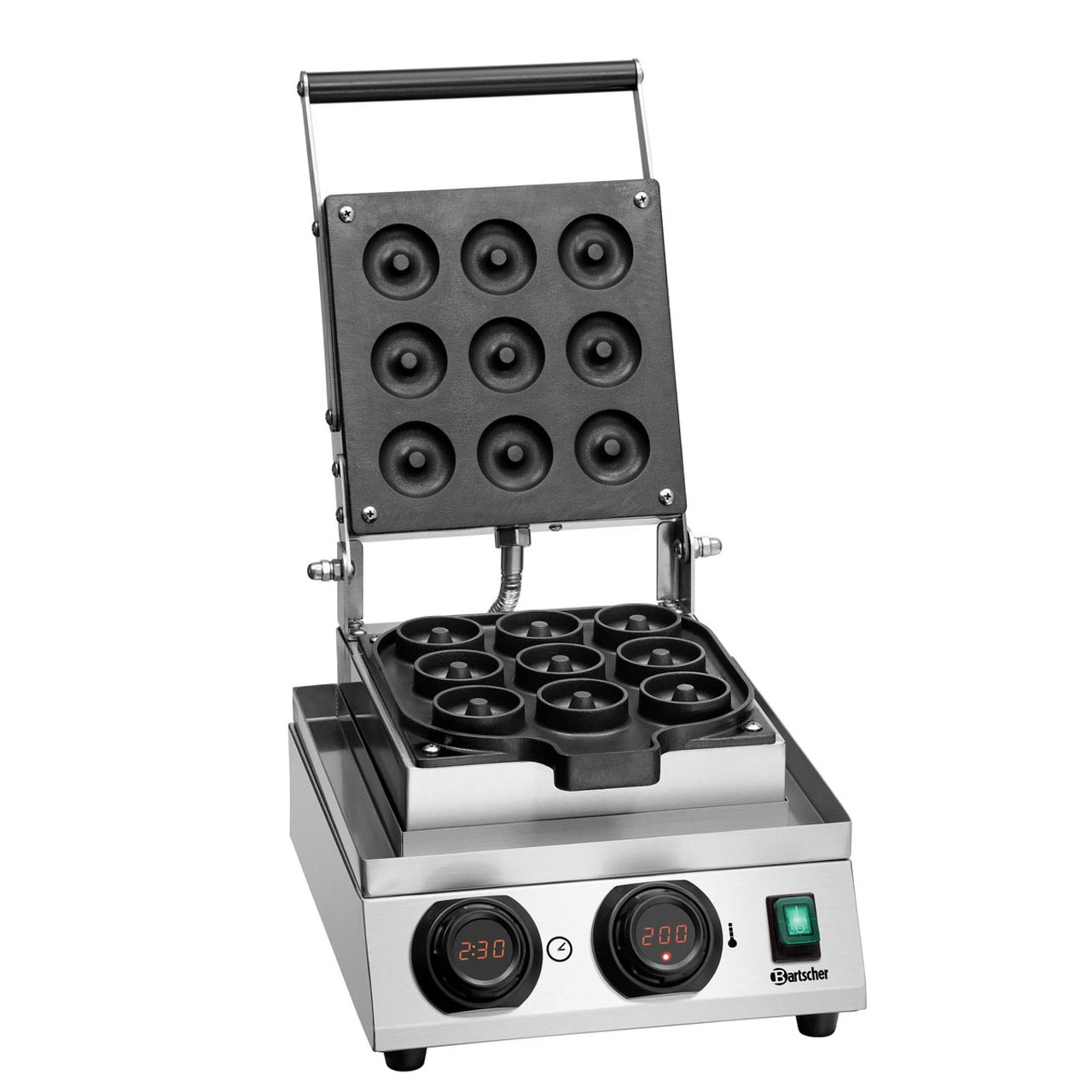 Hliníkové nepřilnavé kulaté vaflové plechy na pečení, tvar „Donut“, trvale namontované, rozměr vafle průměr 50 mm, výška 20 mm. 1 vaflový plech se 9 kulatými formami. Materiál nerezová ocel. Včetně odkapávací misky. Teplotní rozmezí od 50 do 300 °C, elektronická regulace teploty po 1 °C, manuální ovládání, digitální displej, časovač. Kontrolka zahřívání, signalizace uplynutí času (0 - 9:30 minut). Příkon: 1,8 kW / 230 V / 50/60 Hz. Rozměr: Š 300 x H 390 x V 250 mm. Hmotnost: 8,94 kg.