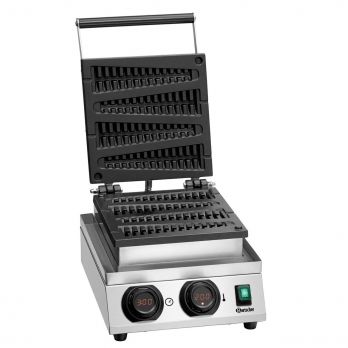Hliníkové nepřilnavé vaflové plechy na pečení, tvar „Lízátko“, trvale namontované, rozměr vafle 52 x 20 mm, výška 220 mm. Vaflové plechy na pečení s trojúhelníkovým tvarem. Materiál nerezová ocel. Tyčky nejsou součástí dodávky. 1 vaflový plech se 4 trojúhelníkovými formami, teplotní rozmezí od 50 do 300 °C, elektronická regulace teploty po 1 °C, manuální ovládání, digitální displej, časovač. Kontrolka zahřívání, signalizace uplynutí času (0 - 9:30 minut). Včetně odkapávací misky. Příkon: 1,8 kW / 230 V / 50/60 Hz. Rozměr: Š 300 x H 440 x V 250 mm. Hmotnost: 11,95 kg.