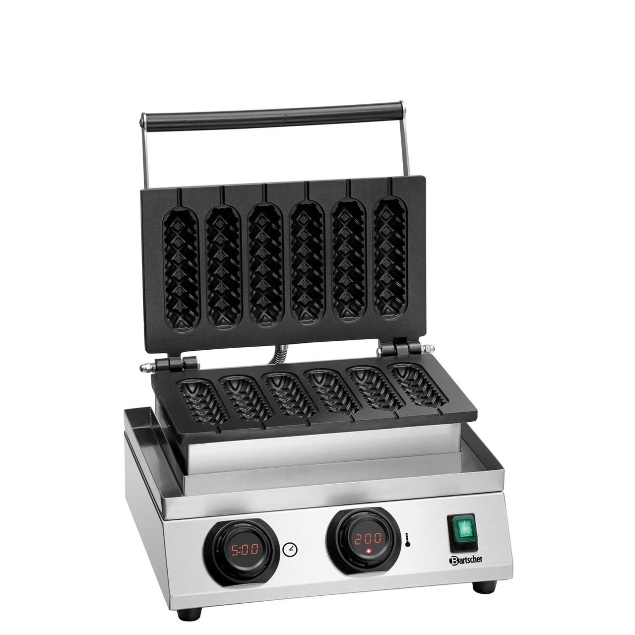 Hliníkové nepřilnavé vaflové plechy na pečení, tvar „Nanuk“, trvale namontované, rozměr vafle 40 x 30 mm, výška 140 mm, 1 vaflový plech se 6 oválnými formami. Včetně odkapávací misky. Materiál nerezová ocel. Tyčky nejsou součástí dodávky. Teplotní rozmezí od 50 do 300 °C, elektronická regulace teploty po 1 °C, manuální ovládání, digitální displej, časovač. Kontrolka zahřívání, signalizace uplynutí času (0 - 9:30 minut). Příkon: 1,8 kW / 230 V / 50/60 Hz. Rozměr: Š 365 x H 380 x V 245 mm. Hmotnost: 10,14 kg.