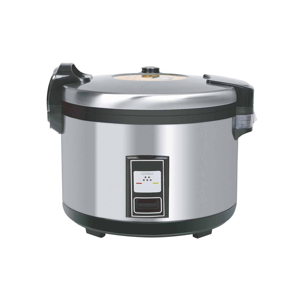 Elektrický hrnec na vaření rýže o objemu 5,5 l z nerezu. Rozměry 43 x 36 x 39,1 cm.