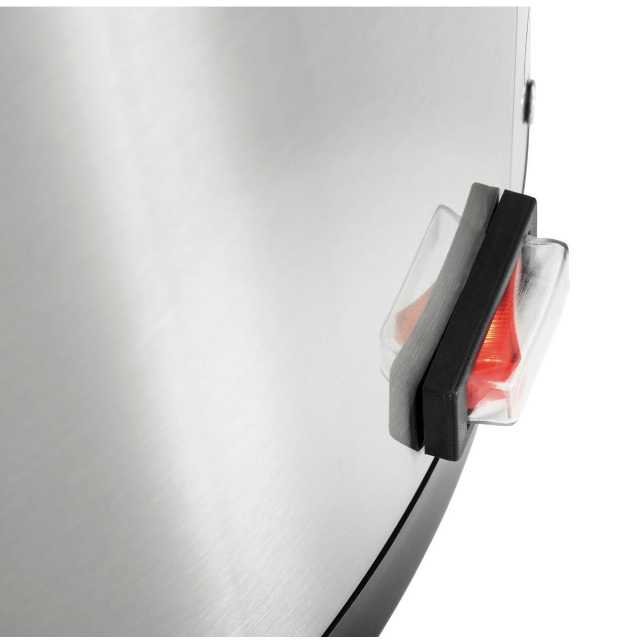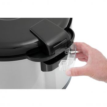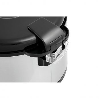 Rýžovar pro vaření rýže a udržování teploty, bez lepení nebo připalování. Vyjímatelný vnitřní hrnec a silikonová podložka jako ochrana proti připálení také zaručují rychlé a snadné čištění. Včetně 1 odměrky, 1 lžíce a 1 vidlička na rýži, 1 silikonová podložka. Silikonovou podložku můžete také zakoupit zvlášť z naší nabídky. Parametry: Obsah: 6 litrů Objem produkce rýže: 25-30 porcí Indikátor světla: vaření, udržování tepla; vypínač ZAP/VYP Funkce: vaření, udržování tepla Vnitřní hrnec: hliník s nepřilnavým povrchem, odnímatelný, tepelně odolný Barva: nerezová ocel/černá Materiál: nerezová ocel Příkon: 2,08 kW / 230 V / 50/60 Hz. Rozměr: Š 450 x H 390 x V 345 mm. Hmotnost: 6,9 kg.