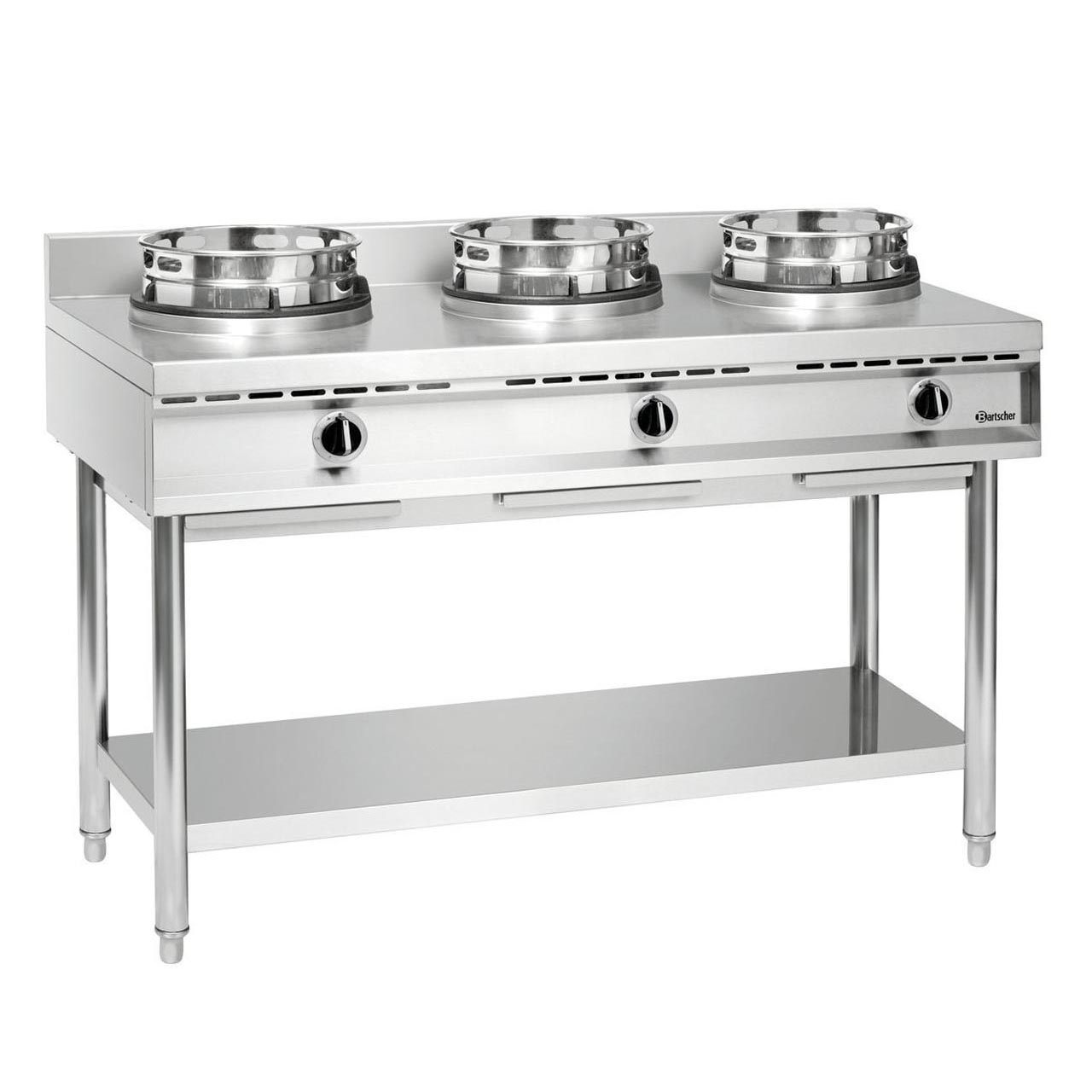 Vysokovýkonný plynový sporák Bartscher pro WOK je vyroben z chromniklové oceli 18/10. Na propan-butan, trysky zemního plynu jsou přiloženy. Nádržka na sběr tuku. Ruční zapalování. Pro hrnce a pánve od průměru 200 mm, průměr varné desky je 290 mm. Hořák lze vyjmou a je tepelně elektricky zajištěn. Sporák se 3 hořáky o výkonu 34,5 kW (3 x 11,5 kW).