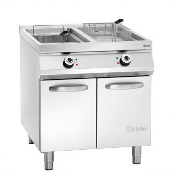 Volně stojící elektrická fritéza s výpustným ventilem. Fritéza elektrická s objemem 2 x 20 litrů. Spodní konstrukce s křídlovými dveřmi. Materiál nerezová ocel, CNS 18/10. Jednoduchá údržba. Provozní režim: elektrický 2x vana, objem 2 x 20 litrů 2x fritovací koš, rozměr: Š 290 x H 450 x V 115 mm Spodní konstrukce: uzavřená, křídlové dveře. Nastavitelné nohy od 900 do 950 mm. Nádoba na zachycení mastnoty, výpustný ventil tuku. Přepínač ovládání, včetně 2 košů. Vypínač zapnuto/vypnuto: ne Příkon: 34,8 kW / 400 V / 50/60 Hz / připojení 3 NAC. Rozměr: Š 800 x H 900 x V 900 mm. Hmotnost: 88,8 kg