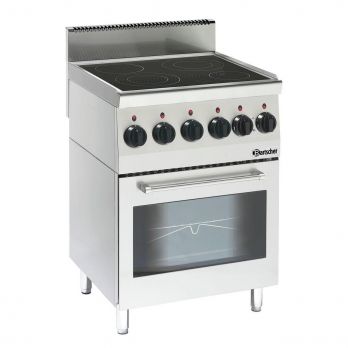 Elektrický sporák s elektrickou troubou. 4 Elektrické plotýnky sklo-keramika. Sporák volně stojící v kvalitním nerezovém provedení. Stabilní nožky s nastavitelnou výškou. Materiál CNS 18/10. Provozní režim: elektrický. Povrch vaření: sklo, typ varné plochy sklo-keramika. 4 varné zóny, elektrické. Rozložení 2 x 2,5 kW, 1 x 1,8 kW, 1 x 1,2 kW Rozložení plochy: 2 x pr. 230 mm, 1 x pr. 180 mm, 1 x pr. 145 mm Elektrická trouba: objem 58 litrů, příkon: 2,2 kW, rozměr: Š 450 x H 380 x V 315 mm. Funkce trouby multifunkční: cirkulující vzduch – gril – horní a dolní teplo. Dvojité zasklení. Včetně 1 roštu a 1 plechu. Nastavitelné nohy. Teplotní rozpětí od 50 do 250 °C. Příkon: 10,2 kW / 400 V / 50 Hz, 3 NAC. Rozměr: Š 600 x H 600 x V 900 mm. Hmotnost: 58 kg.